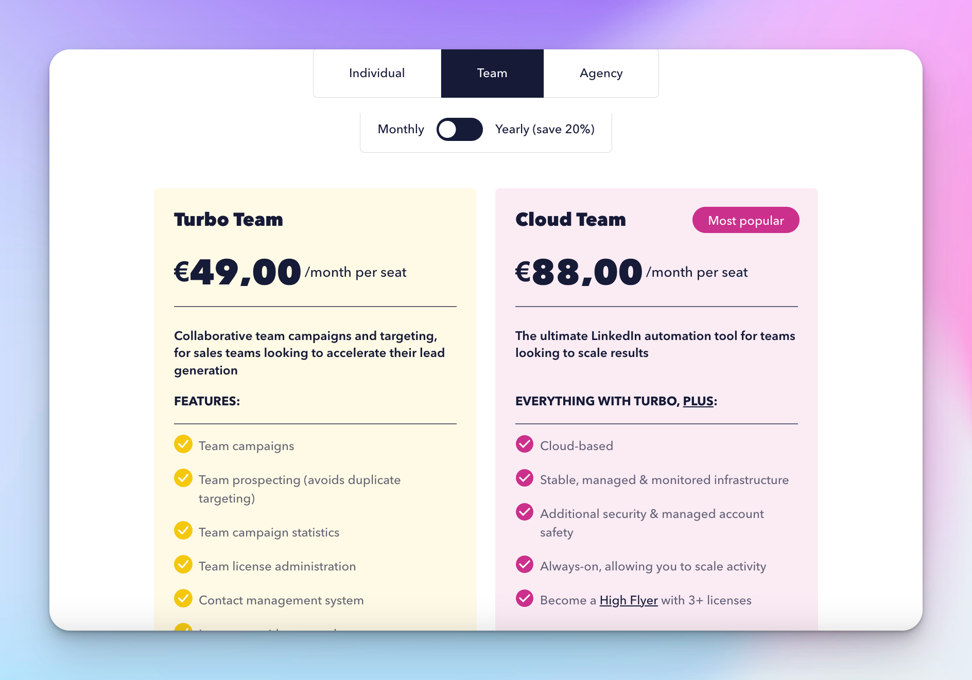 1. Turbo Team: €49.00/month per seat (€36.25/month billed annually)