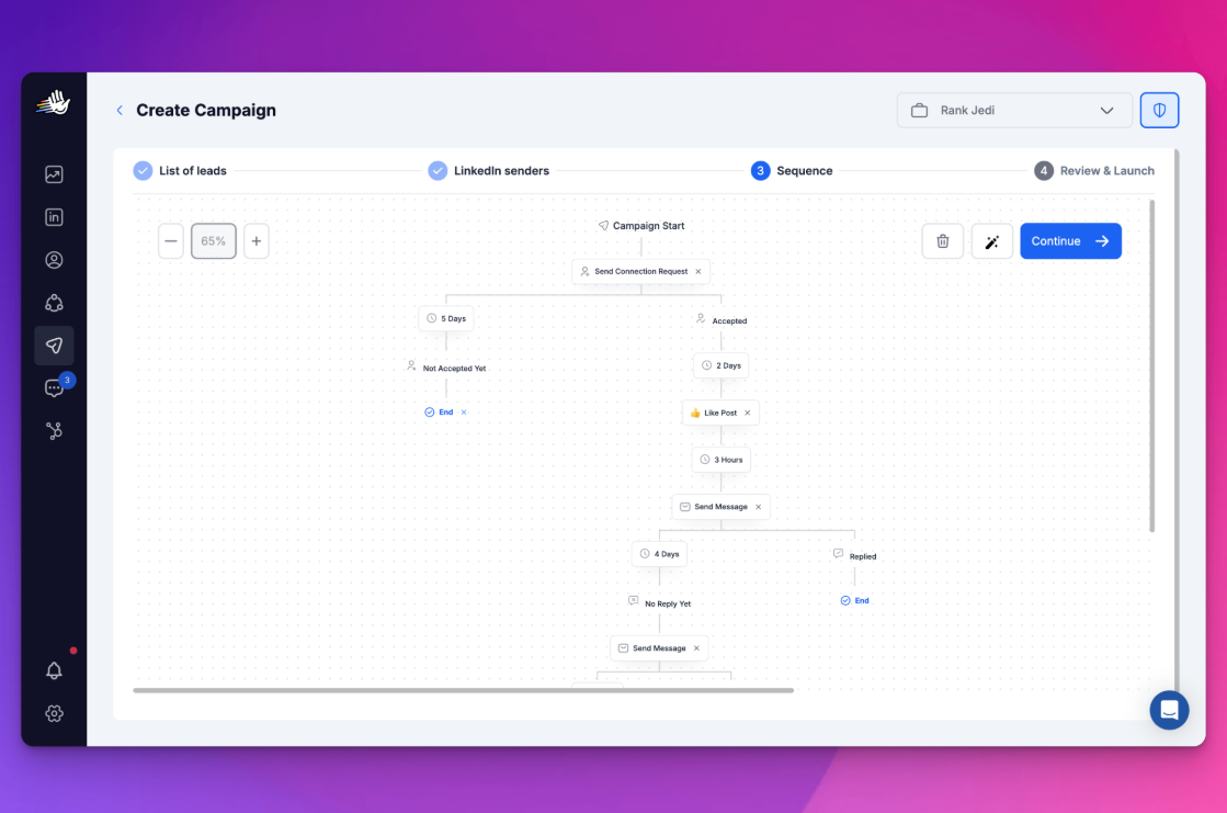 After selecting the LinkedIn account you want to involve as senders in the campaigns, the next step is to set up your campaign sequence.