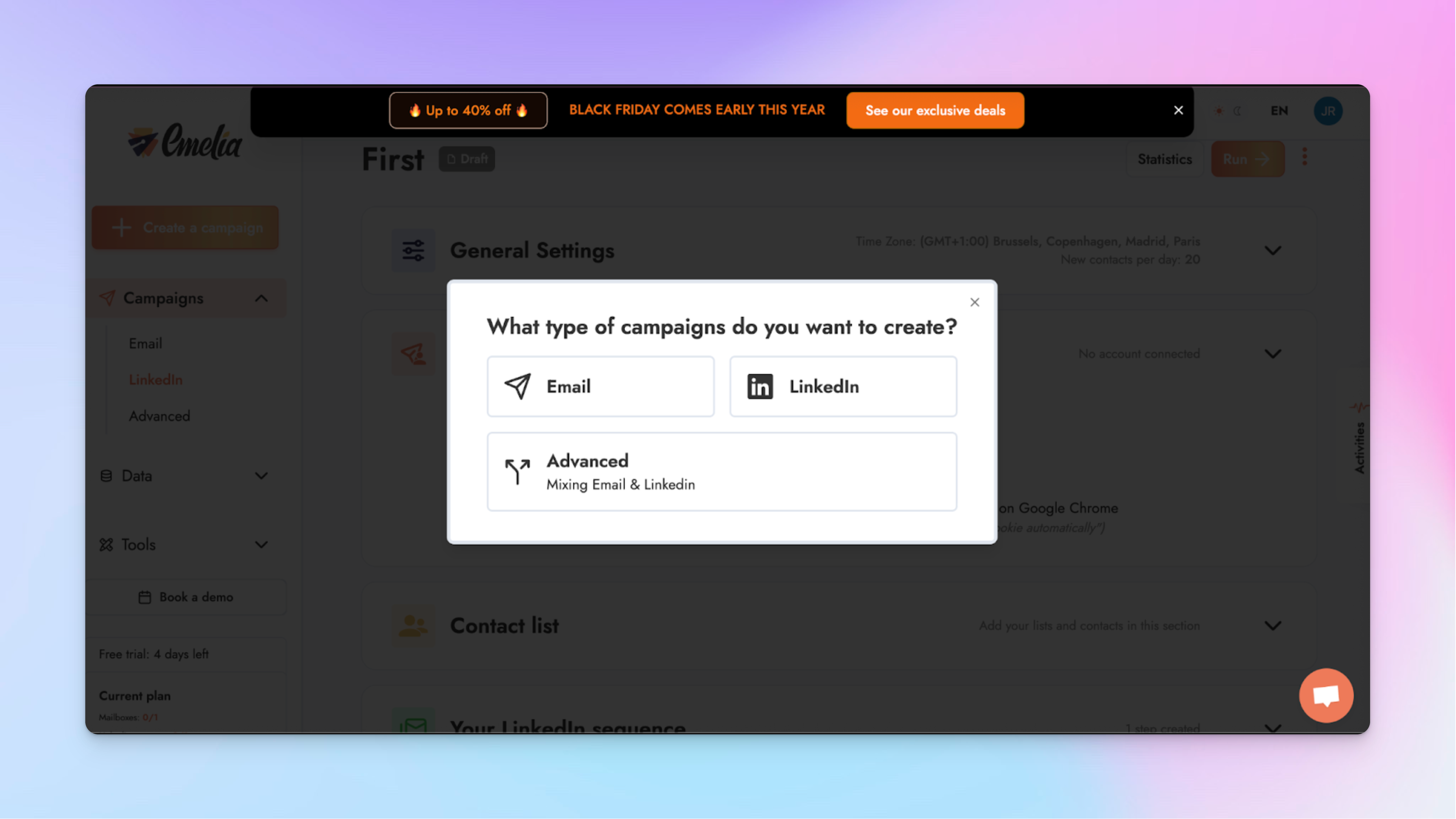 emelia.io supports multi-channel outreach by combining cold emailing and LinkedIn automation in a single workflow. You can build adaptive sequences with delays, connection requests, LinkedIn messages, and follow-ups. Each step reacts to lead behavior, e.g., replies pause campaigns, unaccepted invites stop next messages.