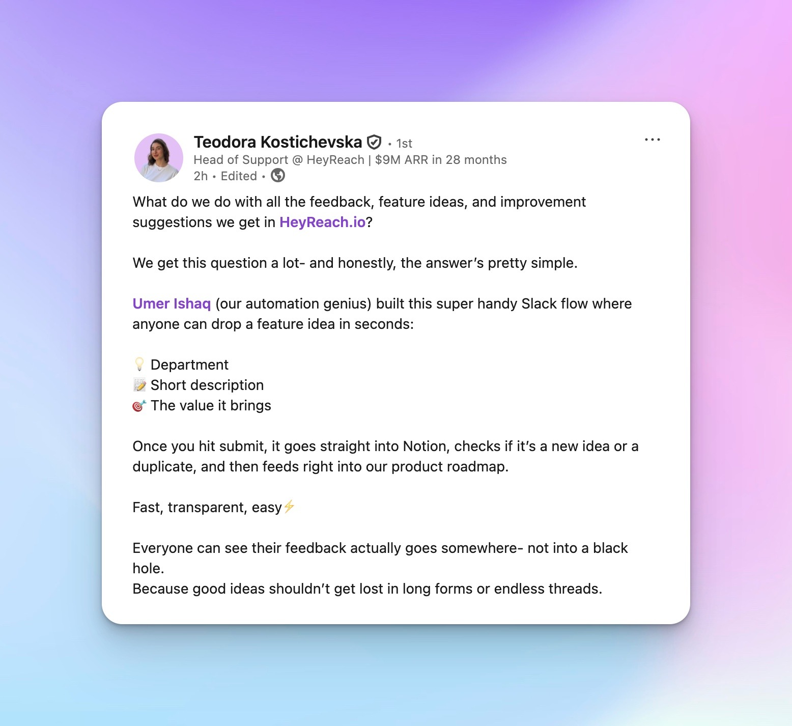 At HeyReach, you get a customer support team readily available to help you fast. This is not us singing our praise; there are shoutouts to our amazing customer team all over the internet.