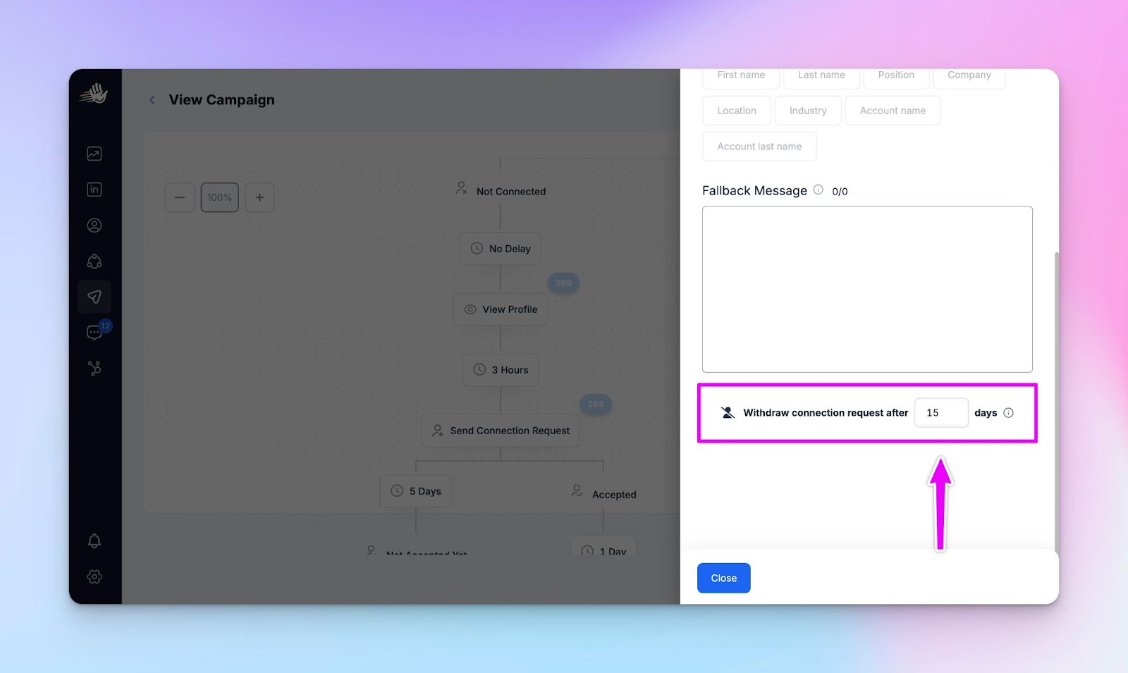 HeyReach helps you with housekeeping, so you’re also able to set withdrawals of unanswered connection requests after a certain period of time.