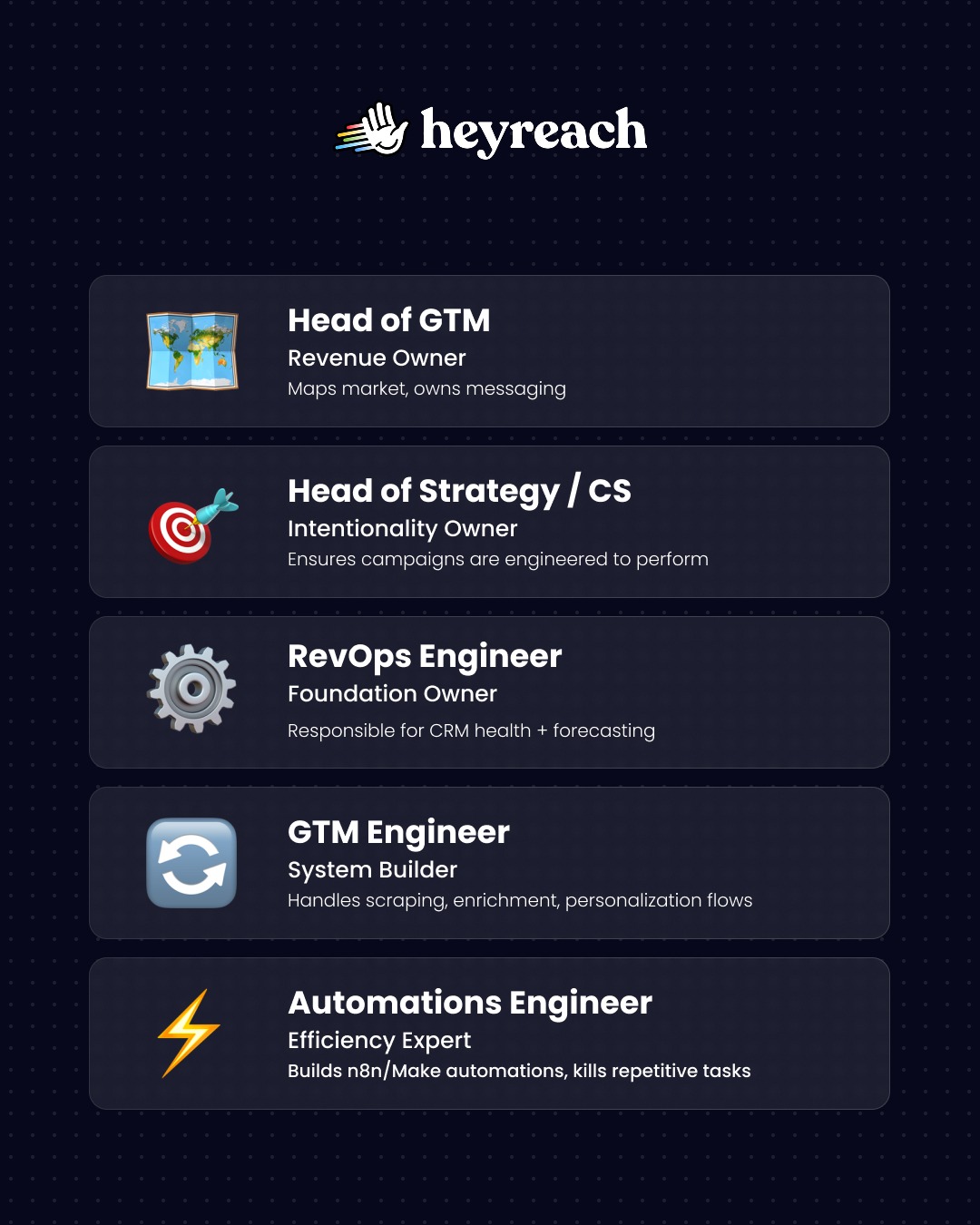 - Mission: Responsible for identifying market opportunities during the early stages of growth. They map the market, own the messaging, and define the ICP. They don't just send messages, but decide who gets them and why.
