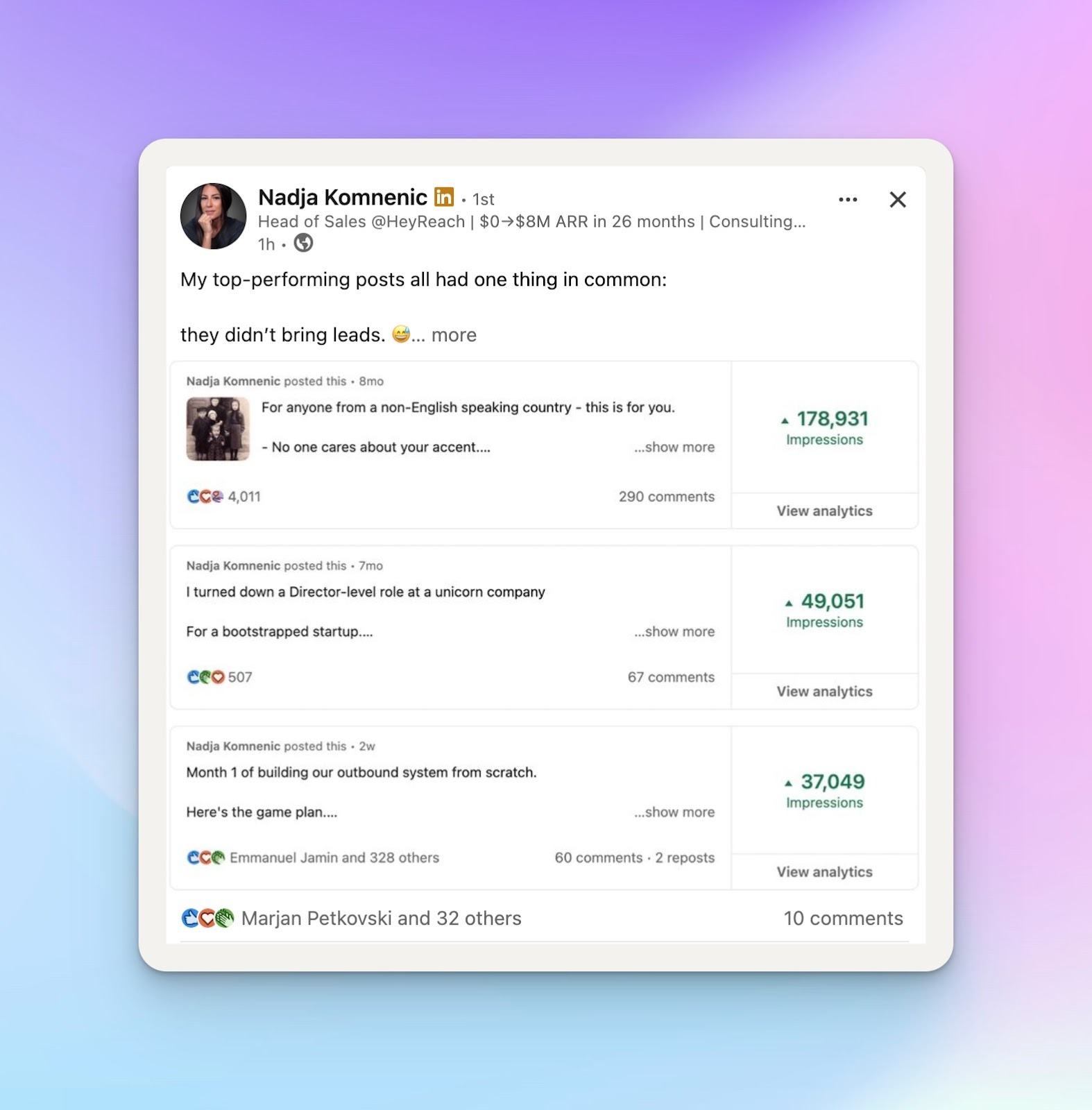 - Nadja Komnenic, our Head of Sales, recently talked about her best-performing LinkedIn posts and how they didn’t bring her any leads. Check out her full post for actionable tips on how to adjust your content for top, middle, and bottom of the funnel so you can build an impactful lead gen system without losing your human voice.