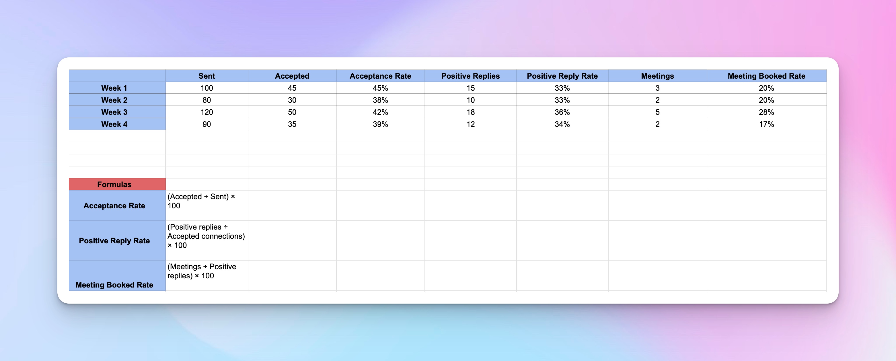 The remaining 3 columns (Acceptance Rate, Positive Reply Rate, Meeting Booked Rate), you will calculate using the formulas we provided in this article, and then add them to their respective fields.